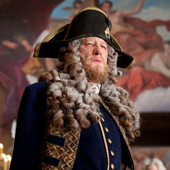 Following an encounter with Blackbeard, Hector Barbossa traded black and silver for the grand blue and gold uniform, including a black and gold naval officer's bicorne hat,[4] when he served as a privateer of His Majesty King George II's Royal Navy. Barbossa wore the bicorne as captain of the HMS Providence and throughout the quest for the Fountain of Youth, where he got his revenge by defeating Blackbeard, though briefly changed into his old pirate regalia while taking possession of the Queen Anne's Revenge.[5] By the following year, as he settled into a growing and prosperous pirate empire, Captain Barbossa went on to wear another, even more richly decorated bicorne hat, notably wearing it during the search for the Trident of Poseidon.[6]