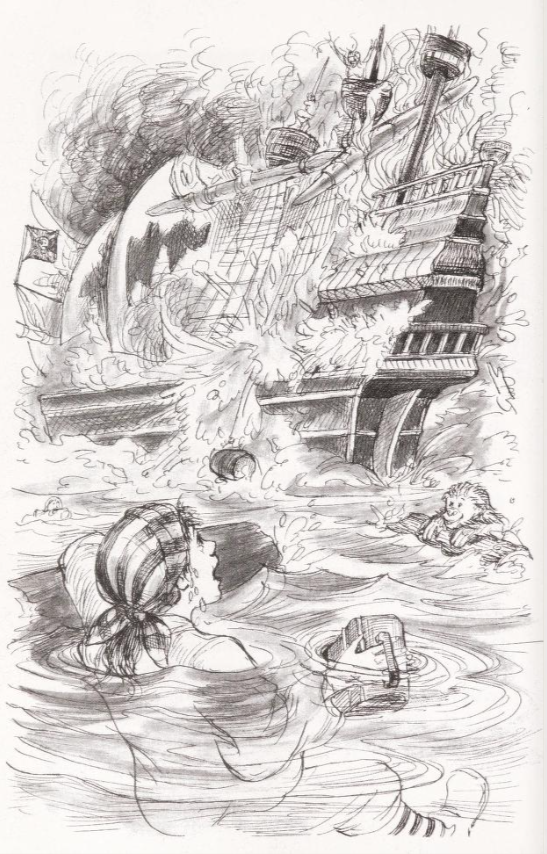 One day the Buzzard encountered the Santa Catalina, a large Spanish Royal Navy galleon whose cargo hold was filled to the brim with gold for the Viceroy of Zaragona. The pirates attacked the galleon and a fierce battle ensued. When pirates fired a broadside at the enemy vessel, one of the cannonballs struck the galleon's foremast, causing it to fall into the sea, carrying the captain's pet monkey Zita with it. The young crewman Pablo jumped into the water to save the monkey and secretly boarded the pirate ship. Occupied by battle, the pirates didn't notice the stowaway. Pablo snuck into the captain's cabin from which he took an iron box full of jewels. He also entered the gunpowder storage room where he made a trail of powder, lighting up one end which would eventually ignite the rest of the powder. Right after he struck the match, Pablo was noticed by Sharkheart Sam himself, who tried to intimidate him into returning the jewels. Pablo and Zita run away, jumping overboard right when the fire caused the explosion which blew up the Buzzard, sinking the ship.[5]