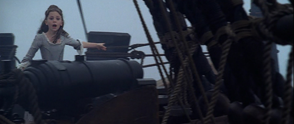 Young Elizabeth Swann beside a carronade on the Dauntless.