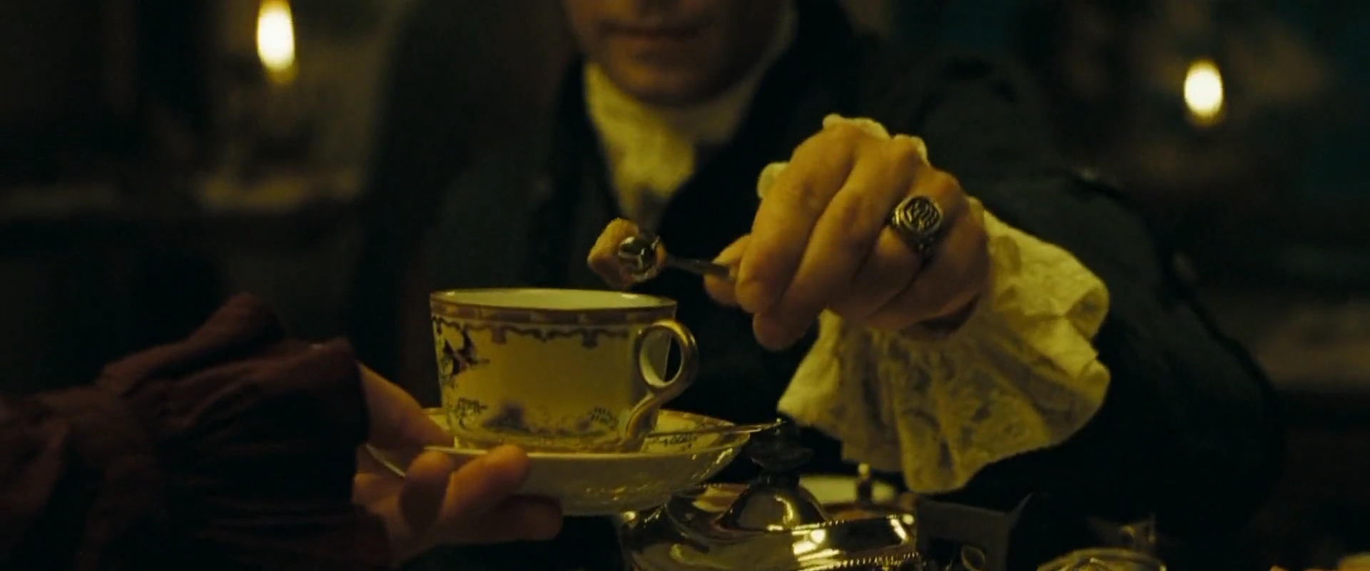 Lord Cutler Beckett drops a sugar cube into Will Turner's cup of tea.