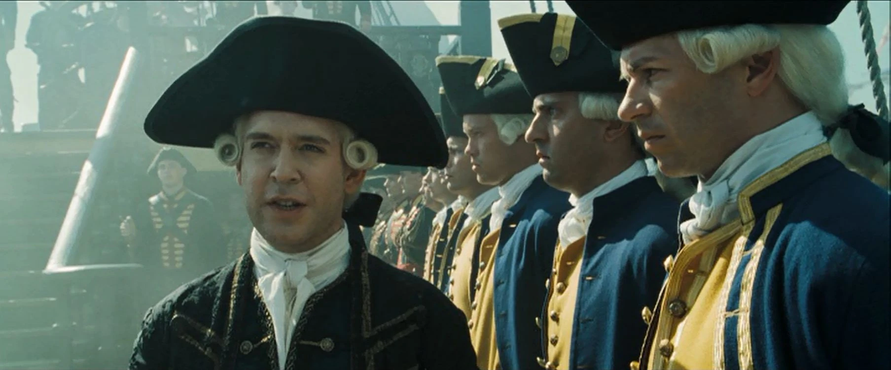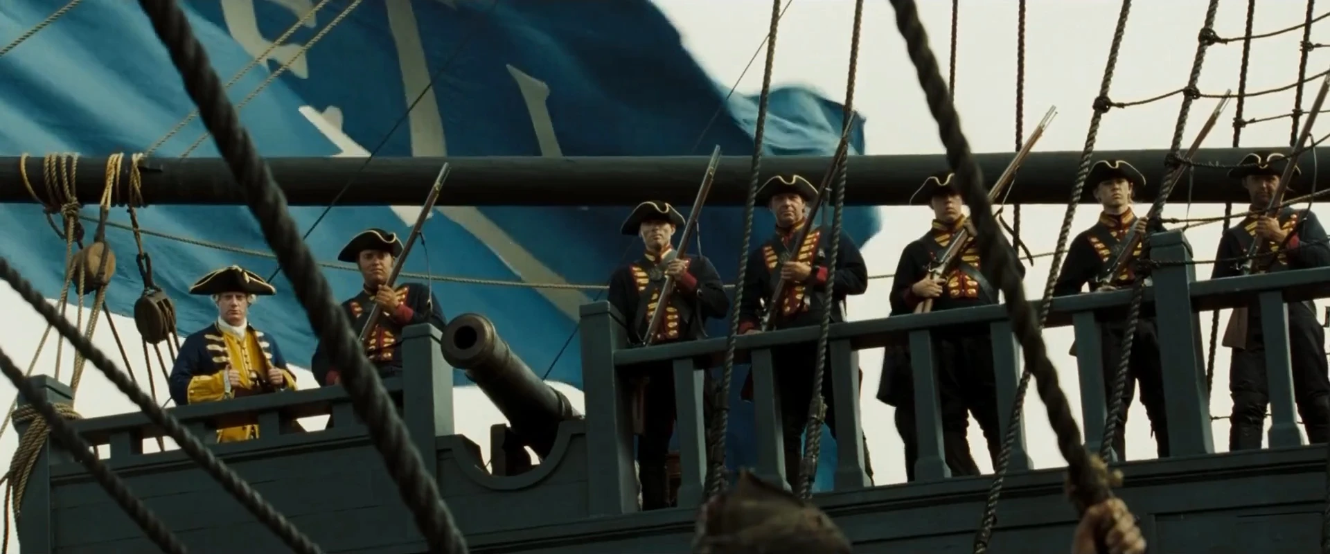 Prior to 1729, the HMS Endeavour became a ship that carried a crew of sailors of the British Royal Navy and soldiers of the East India Trading Company led by Lord Cutler Beckett, who sailed to Port Royal with arrest warrants for William Turner, Elizabeth Swann, and former Commodore James Norrington. The Endeavour crew were among the EITC soldiers that ran through the streets of Port Royal lead by a bodyguard to arrest Turner in the blacksmith shop. Beckett was with the rest of the crew as they arrested Swann. Beckett's bodyguard held back Swann, while a redcoat restrained Turner. An officer of the crew removed Beckett's coat as Governor Weatherby Swann read out the arrest warrants.[3]