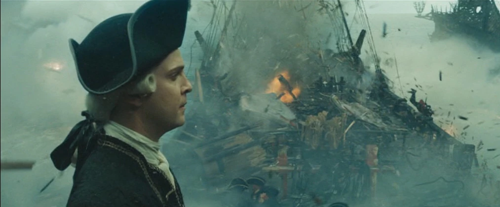 Disregarding his deal with Jack, Beckett ordered that the Endeavour's guns be run out, and move to attack the Pearl. Suddenly, the Flying Dutchman rose from the ocean, now captained by William Turner, and joined the Black Pearl in assaulting the Endeavour in a double broadside from either side, pummeling her with cannon fire.[2]