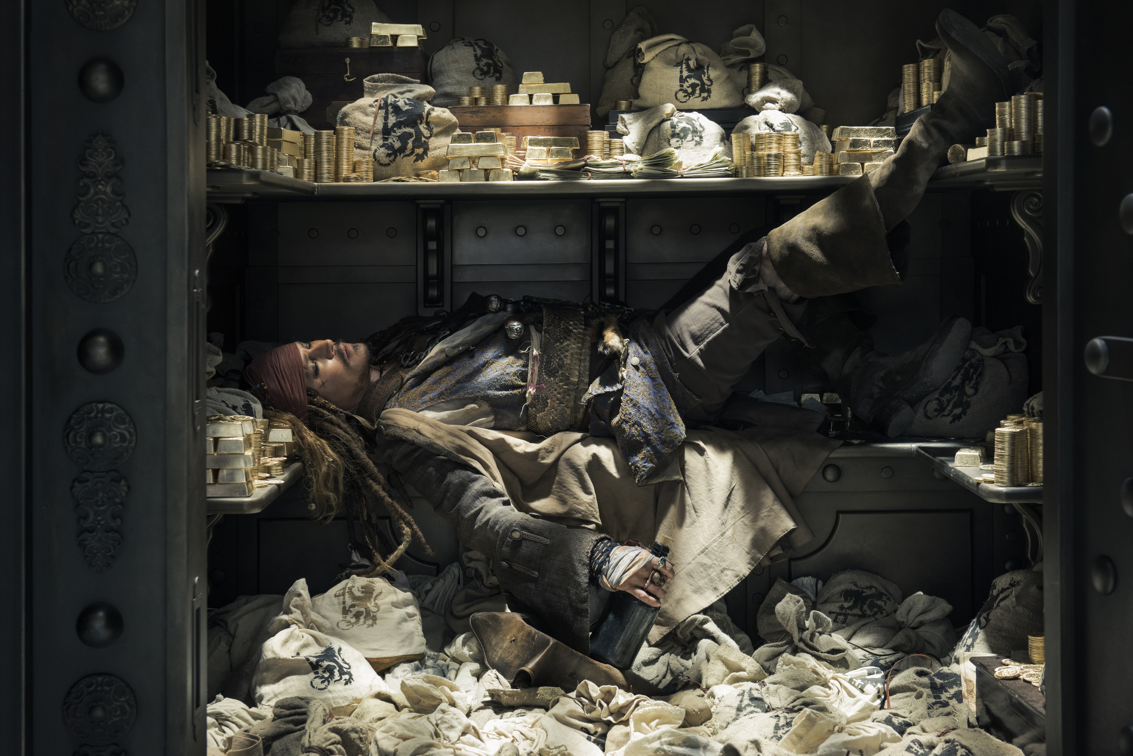 A down-on-his-luck Jack Sparrow sleeps surrounded with all forms of currency in the vault of the bank of Saint Martin.