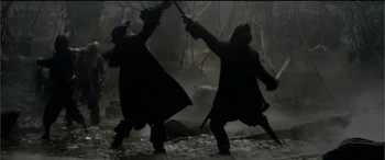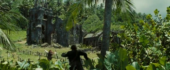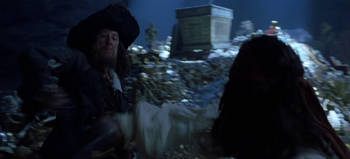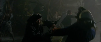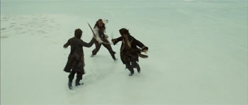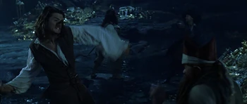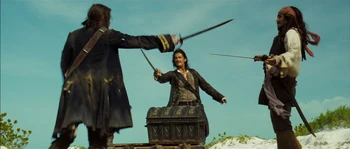 Hector Barbossa and his crew arrived to Isla de Muerta with Will Turner to lift the curse of Cortés. Jack Sparrow interrupted the ritual and enter negotiations with Barbossa, which ends with Barbossa sending all but a few of his crewman to attack the HMS Dauntless and Jack stealing one of the cursed Aztec gold from the Chest of Cortés. Shortly after, the battle begins as Jack throws a sword to Will, who fights Barbossa's crewmen, while Jack dueled with Barbossa.----Will Turner would fight Jacoby, Weatherby, and Monk alone through the battle. As he was about to be killed, Elizabeth Swann arrived to save Will and assist him in battle. | Elizabeth Swann helped Will in defeating Barbossa's crewmen as Jack threw his Aztec coin to Will. Barbossa prepared to shoot Elizabeth until Jack shot him in the heart with his last pistol shot. Will, having sliced the palm of his hand with the sacrificial knife and covering the coins with his blood, dropped both his and Jack's coins into the chest. With the coins returned and the blood repaid, the curse was lifted and Barbossa died. |
