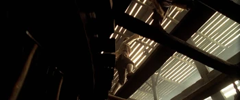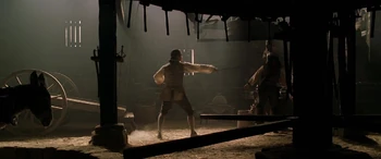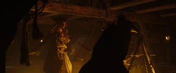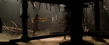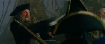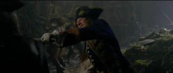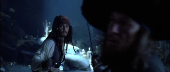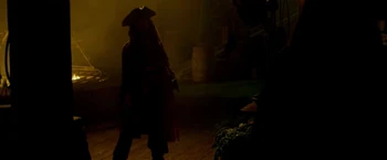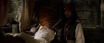 | Jack Sparrow used John Brown's smithy as a hiding place to break his manacles after escaping Commodore James Norrington and his men of the Royal Navy. Will Turner arrived shortly afterwards and confronted Jack, who thought Will seemed "somewhat familiar". After Will realized that Jack was the pirate who had threatened Elizabeth Swann, a woman he cared deeply about, he engaged Sparrow in a duel. | Will would soon disarm Jack in their fight. However, through cheating, Jack would ultimately win the duel by pulling out his pistol, aiming it at Will. As Will blocked Jack's exit, Jack pleaded to Will to step aside, in which he refused. Even when he desperately didn't intend to do so, Jack prepared to shoot Will, so he could escape. But before he had the chance, Jack was knocked out by Mr. Brown and was captured by Norrington and his men. |