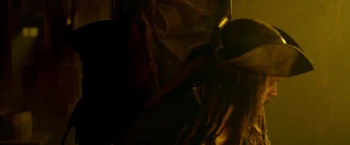 | In London, Jack Sparrow was being pursued by King George II's Royal Guards while leaping from moving carriages. After being saved by his father, Jack took refuge into the Captain's Daughter tavern, where he would confront an impostor who was impersonating him. As each Jack followed the exact movements of the other, the huge swordfight in the storeroom began. | Eventually, Jack would realize who the impostor was after the other Jack performed a familiar technique. He and other Jack clashed their swords before the two share a kiss—Jack's greeting to Angelica. Both Angelica and Jack have a brief reunion, until the King's Royal Guards break into the storeroom and fight against Jack and Angelica. The Guards aim their muskets at them. Jack and Angelica escape through a trapdoor and swam away, surfacing in the River Thames. |