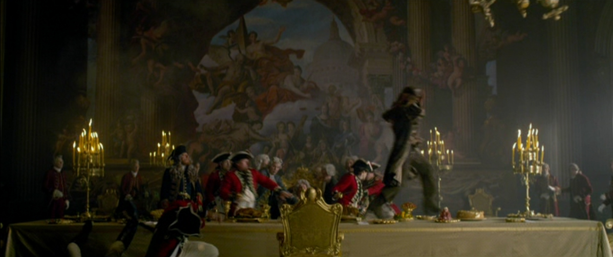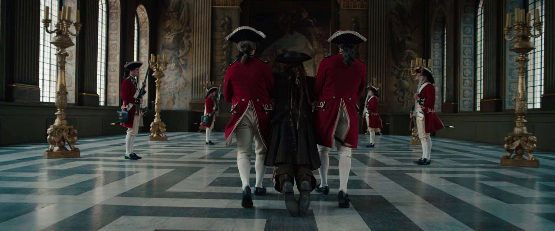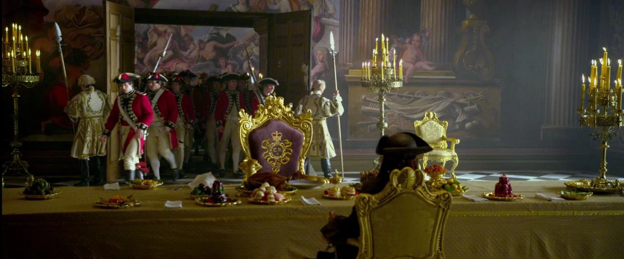 Jack Sparrow was forcibly brought inside St. James's Palace for an audience with King George II. He was dragged inside the palace by two Royal Guards through the main hall. Inside the royal banquet room, Jack was chained to a regal seat to await the King's arrival. While he was waiting for the King, he tried to grab a cream puff from the table. Right when the doors open, a surprised Jack kicked the cream puff that he desired up into the air where it got stuck on the room's chandelier. As the doors opened, King George arrived with many of his loyal subjects and Royal Guards. The King was accompanied by Prime Minister Henry Pelham and Lord John Carteret.[1]
