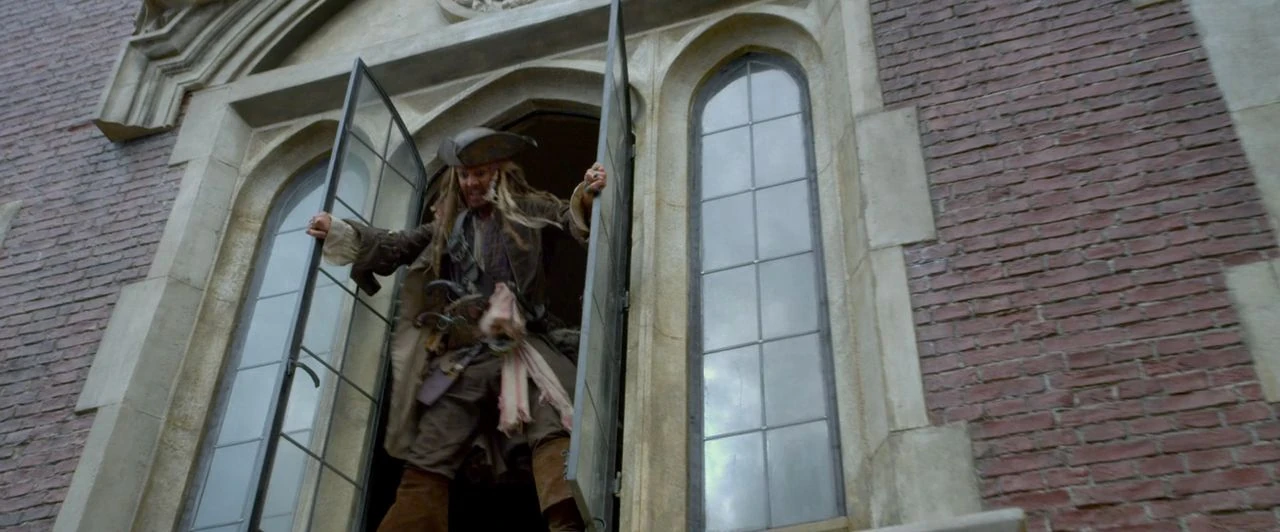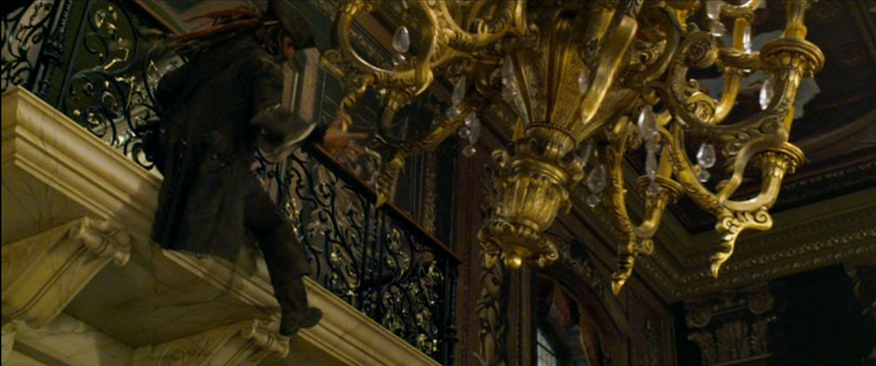 Jack Sparrow broke free and took out the Royal Guards who held him with their muskets, which he used on the chandelier to make it swing. He jumped onto the banquet table, kicked food at another guard and ran along it, with the food flying off. He then jumped off and tossed one of the chairs through the window. A guard pulled out his sword and ran towards Jack, who grabbed the curtain tassels. The guard slipped on a napkin that Jack had tossed on the floor earlier and tumbled out the window, which gave Jack the chance to fly up onto the top of the sill escaping a slash of the captain of the guard's sword. He leapt to grab the chandelier and swung across the room. King George, Hector Barbossa and the King's subjects stared at the seemingly impossible escape. Jack made it to the balcony, and grabbed the creme puff that was stuck on the chandelier and ate it as he left.[1]