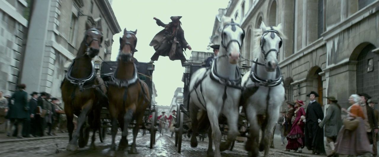 On top of the carriage, Jack saw more guards running after him. He managed to stand up on top of the moving carriage which soon drew near another one, and Jack leapt over. He lost his balance slightly, and put each foot on one carriage. As soon as the carriages parted ways, Jack moved both of his feet onto one carriage. He jumped onto a small cart with a coffin, landing on his face. Jack looked up to see that the guards had taken a shortcut through the city. Seeing no other option, Jack jumped onto a single plank of wood, carried by two men, then stepped on a man's top hat and onto a coal wagon.[1]