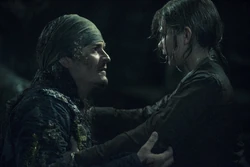 Fate was at work throughout the quest for the Fountain of Youth, where Jack Sparrow noted that Blackbeard had a high regard for fate, with the dreaded pirate believing that "the fates had spoken, the threads of destiny woven" after learning of a prophecy of his own death by a "one-legged man" foreseen by his zombie quartermaster, which led to his need to reach the Fountain of Youth.[4] Jack would learn of this from Blackbeard's daughter Angelica, who said the quartermaster was known as eleri ipin, which means "witness of fate", that he could divine the future and that he was never wrong.[29] In the affairs of Jack and Angelica, a turning, twisting fate had bound them together for a second time, and they felt a mutual attraction, despite being a danger to each other.[30] Following Sparrow's mutiny aboard the Queen Anne's Revenge, despite Angelica's pleas of mercy, Blackbeard responded by giving the Cook a chance to determine his own fate, only to unleash Greek fire.[4] The fire was part of a voodoo ritual that zombiefied the Cook, and looking into his cold dead eyes, Jack knew it was a fate worse than death.[31] The "one-legged man" that Blackbeard was fated to meet was Hector Barbossa, now a privateer wearing a wooden leg and with an agenda of revenge against Blackbeard for a past encounter in which Barbossa lost the Black Pearl and his right leg.[32] Privateer Barbossa, a self-proclaimed master of his fate, believed fortune favored him as he collected poison dart frogs as a "hobby" on a Caribbean island, then entered an uneasy alliance with Jack Sparrow in a rendezvous with Blackbeard and destiny at the Fountain.[33] Feeling the cold breath of fate, Blackbeard had one last fight where he met his death through Barbossa's poisoned blade.[4]