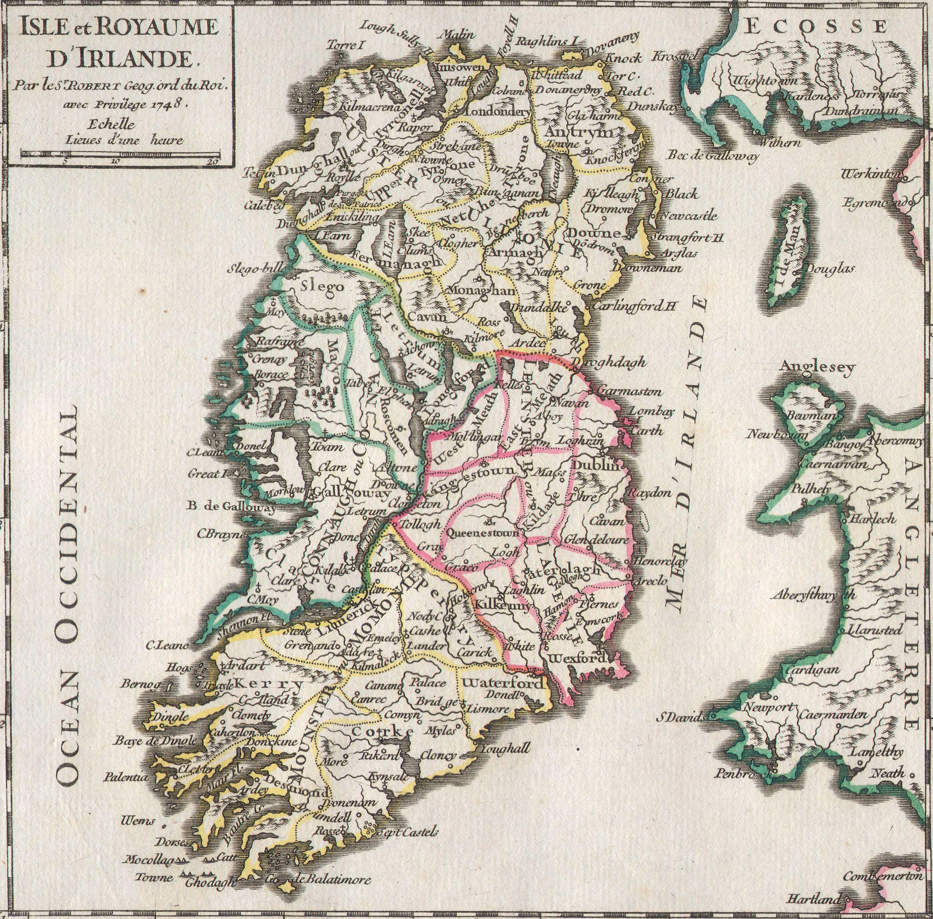 Ireland was an island in the North Atlantic Ocean, in north-western Europe. It was separated from Great Britain to its east by the North Channel, the Irish Sea, and St George's Channel. Ireland is the second-largest island of the British Isles, the third-largest in Europe, and the twentieth-largest in the world. The geography of Ireland comprised relatively low-lying mountains surrounding a central plain, with several navigable rivers extending inland.