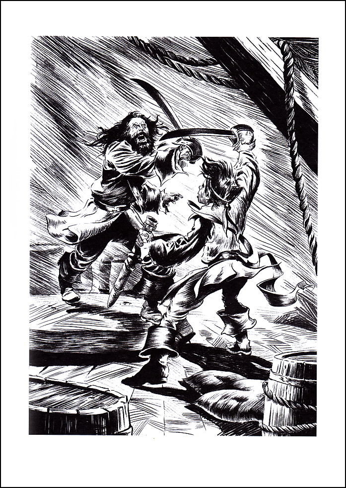 The three pirates discover Jack and start chasing him because he holds the Scabbard of the Sword of Cortés. Jack manages to find Arabella and Fitzwilliam, and they hide together. Unfortunately, Louis and his two thugs have found and captured Tumen and Jean. Left with no options, Jack comes out to battle the terrifying pirate. Arabella manages to free Tumen and Jean, and Fitzwilliam joins Jack in dueling Louis. Louis wounds Fitzwilliam, but Jack knocks down Louis with the sack of flour and takes the Sword of Cortés from him.