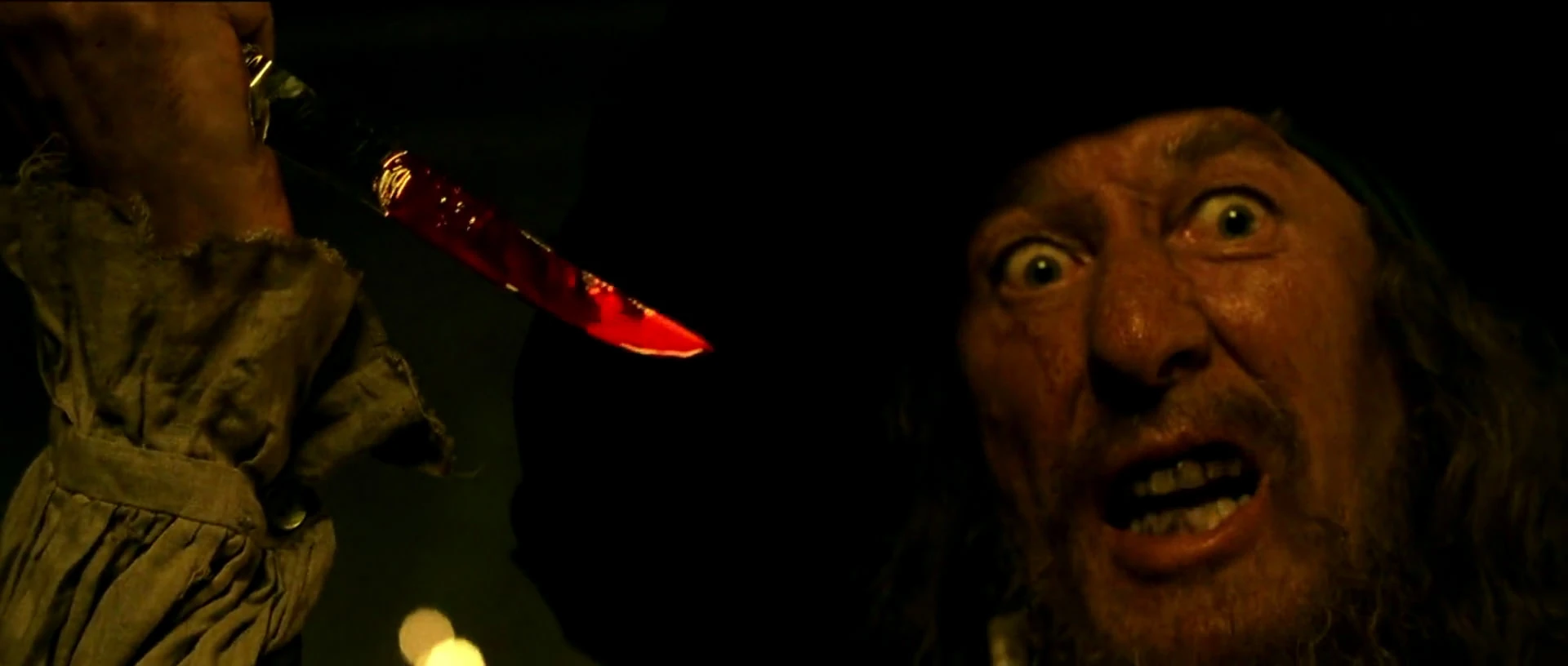 The cursed Hector Barbossa holds a knife covered in his own blood.