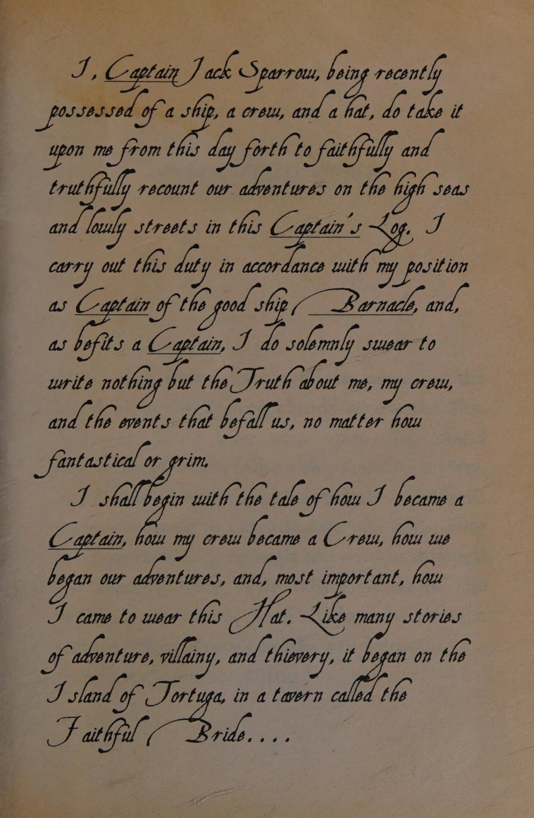 - "I, Captain Jack Sparrow, being recently possessed of a ship, a crew and a hat, do take it upon me from this day forth to faithfully and truthfully recount our adventures on the high seas and lowly streets in this Captain's Log."