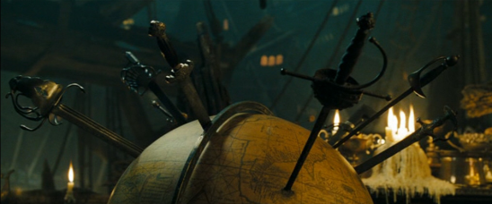 The Pirate Lords' swords embedded in the globe.