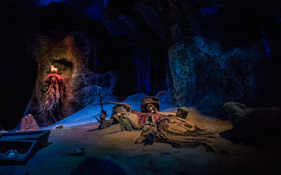 After a hair-raising plunge into the depths of an underground grotto, guests behold the skeletal remains of an unfortunate band of pirates, guarding their loot and treasure with macabre delight. Guests are warned by two ghostly voices of the ancient curse placed on the treasure and see a "cursed pirate" caught in a booby trap as they exit the grotto.