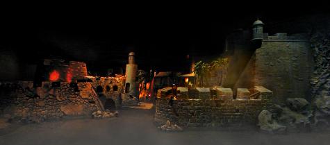 Emerging from the eerie Grotto, the guests find themselves thrust through a blinding mist into in the middle of a fog-enshrouded harbor under cloudy night skies, their bateau caught in the middle of a fierce battle between a pirate galleon, the Wicked Wench, and a Spanish fort on the shore of the island colony. Guests have arrived in the late 1700s, the Golden Age of Piracy.