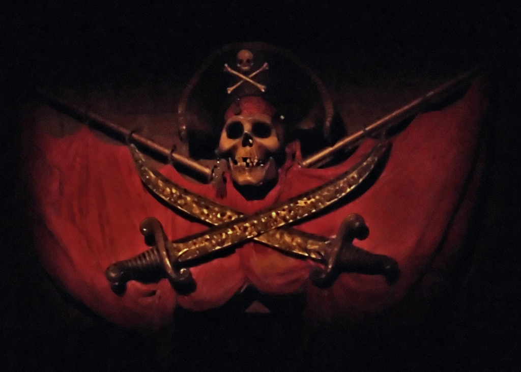 But upon turning a final corner in the brick channel, guests find a talking skull with crossed swords mounted on the bricks above the boat's pathway. The talking skull provides this taunting warning: