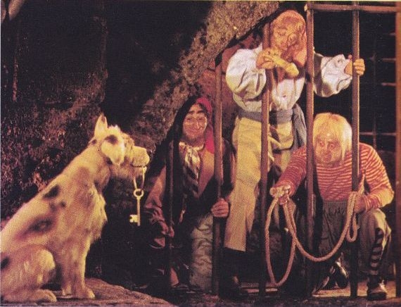 The boats continue their trip through the melee, drifting into the foundations of the town and passing prison cells that are threatened by the looming flames, as are the captive pirates trapped inside. Some of the prisoners are frantically trying to bribe a prison dog into bringing them the keys to the cell, which the dog holds tauntingly in his jaws. Some prisoners try to get the dog, by either offering a bone or getting his attention, while other prisoners have rope to use to get the dog with. Though the prisoners tried hard to retrieve the dog's keys, the dog never moved from where it was sitting.