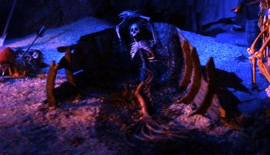 Then a more chilling sound becomes audible: the thundering of a waterfall, down which guests plunge. When they reach the bottom of the waterfall, guests hear the frightening echo of "Dead men tell no tales!" Further into the depths of an underground grotto, guests behold the skeleton remains of an unfortunate band of pirates, guarding their loot and treasure with macabre delight. Through the ominous stone walls of the caverns, and the eerie moonlit scenery, visitors come across a grim tableau: three skeletons that appear to have been seeking treasure in a small cove have reaped their reward: two have been run through with their blades, and the remaining body lies dead next to the now-empty treasure chest. All three skeletons apparently being victims of another band of treacherous villains, or victims of fighting amongst themselves. One skeletal pirate has a seagull make a nest on the dead pirate's hat. Moving through the grotto, the crusty skeletons become more animated, as noted by each of their actions.