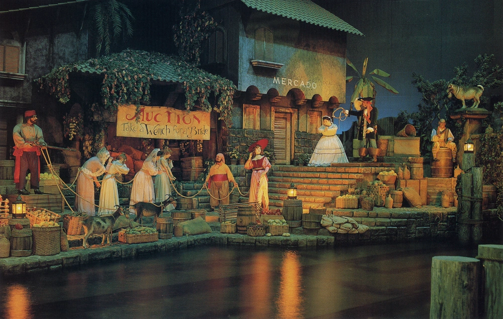 The "auction" scene in which women are offered for sale by the invading pirates had remained largely intact since the attraction opened, though the "Take A Wench For A Bride" banner came and went with some refurbishments.