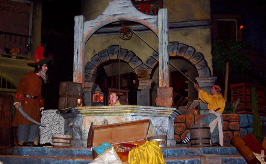Passing through the gates of the sacked town of Puerto Dorado, guests see the first of a number of incredibly detailed scenes of mayhem. First, the magistrate of the town, Carlos, is seen being tortured by being dunked in a well by a group of pirates asking for the location of the town's treasure. "I am no chicken, I weel not talk!" he replies bravely in his Spanish accent, before being dunked yet again. A line of other town villagers stand in a line, bound as prisoners, waiting their turn at being questioned; all of them shivering in fear. The villagers are being held at the gates of the Mayor's home, which has been battered open and ransacked. Carlos' proud wife occasionally peeks out of an upstairs window, shouting at her husband "Don't tell him, Carlos! Don't be chicken!" A pirate's pot shot at the window sill quickly causes the wife to duck back inside, but she'll peek out again before long.