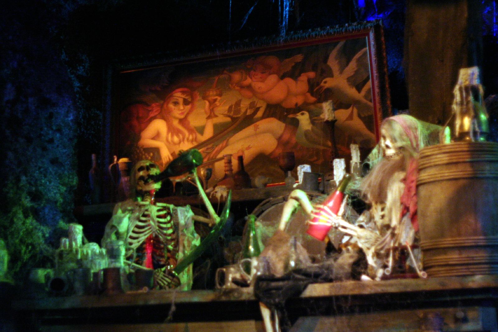 Moving onward, guests pass the "Crew's Quarters," a salty hangout where two pirates appear to have died enjoying their rum and wine; in which one drink trickles through one pirate's exposed rib cage. Pirates seem to have once used this old inn as a homestead, as signs hanging nearby read "Stow yer weapons" and "Thar Be No Place Like Home!" Decorated with remnants from old ships and vessels, this hideaway is adorned with liquor, glassware, and lush artwork. Drifting onward, the guests' boat passes the "Captain's Quarters", rigged with the finest furnishin's money did not buy, where they see the captain himself. The captain, who is nothing more than a bony corpse propped up in his lush bed, can be seen studying a treasure map while his harpsichord plays a melancholy melody as well as a rousing rendition of Yo Ho (A Pirate's Life for Me).