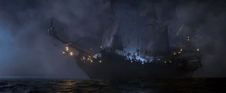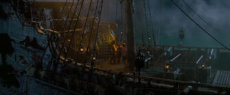 The Revenge was docked when news of Salazar's attacks reached Barbossa's ears. The pirate captain decided to consult with the sea-witch Shansa about the threat. With the information provided, he approached the undead pirate hunters with the intention of bartering with them and ensuring his survival. Armando Salazar and his cursed crew boarded the Revenge and began slaughtering pirates even as Barbossa attempted to negotiate with Salazar. After eventually coming to an accord, Barbossa and the surviving crew members were shanghaied aboard the Silent Mary.[5] Blackbeard's former ship was thus left abandoned in the middle of the high seas, at the will of the wind and tide.[15]