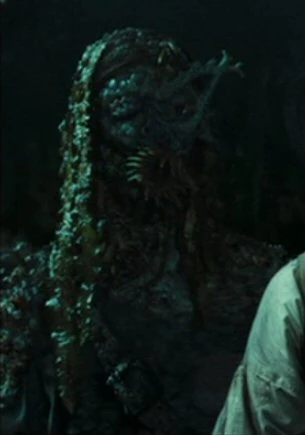 At some unknown point in his life, Quittance became a member of the Crew of the Flying Dutchman under Captain Davy Jones. Quittance was identified by several unique distinguishing features that were the result of serving onboard the Dutchman. Numerous sea creatures became assimilated into his body, including a moray eel in his chest,[4] a clam that took the place of his right eye, an anemone for a mouth, seaweed for hair and starfish hands. His entire anatomy became similar to that of a starfish, giving Quittance the ability to regenerate damaged or lost limbs.[5] When William Turner Jr. appeared aboard the Scuttled ship, the crew fought the young man, Quittance among them. Eventually, Crash knocked him out. Davy Jones boarded the ship, and Turner revealed that Jack Sparrow was nearby aboard the Black Pearl. Quittance and the other crewmen boarded the Pearl, and held back the Motley crew as Jones and Sparrow negotiated.[1]