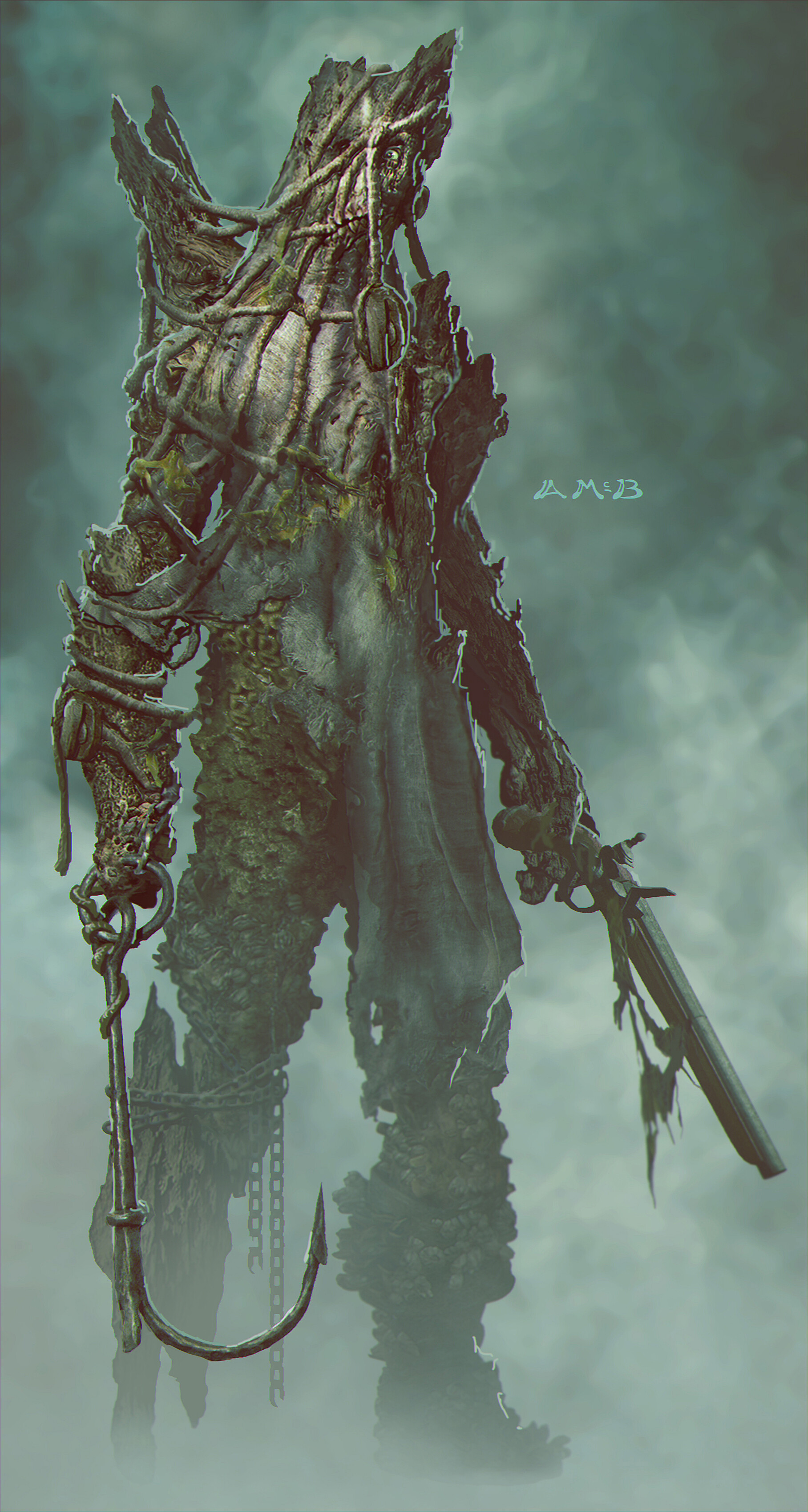 At some unknown point in his life, Ratlin became a member of the Crew of the Flying Dutchman under Captain Davy Jones.[1] The crew of the Dutchman were known to gradually take on characteristics of sea creatures over time, though in Ratlin's case he was most likely one of the crew to have served on the ship the longest as it was the ship itself that became part of his biology. Ratlin had tarp of sail canvas over his face and rigging rope on top of that,[4] while most of an entire ship's mast became attached to his back and his right foot morphed into a stump of a driftwood. Meanwhile a whole flintlock rifle and a rusty fishing hook fused to his right and left hands respectively yet served him well in combat.[citation needed] Ratlin was one of the four most trusted mates aboard the Flying Dutchman, along with three others: Maccus, Penrod, and Angler.[3]