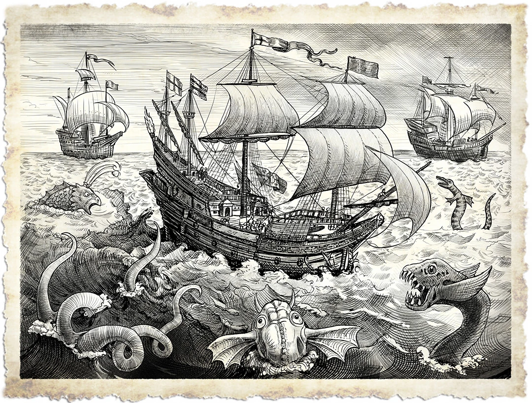 A fleet of ships surrounded with sea monsters.