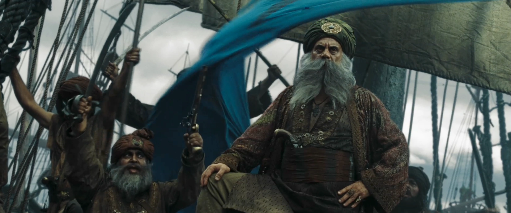 Unfortunately the Brethren's small fleet were confronted by Beckett's entire armada lay before them. Realizing it was too late to retreat, King Swann, Jack Sparrow, and Hector Barbossa attempted to parley with the Company. No agreement was reached however, and the battle was iminent. King Swann ordered the fleet to raise the colours, and Sri Sumbhajee ordered his flag to be raised and gazed over the sea with dark forboding. Soon after this the skies darkened and a storm formed around the fleet and a massive maelstrom formed in between the two fleets, perhaps as Sumbhajee had percieved. Sri Sumbhajee and his crew watched as Hector Barbossa's ship, the Black Pearl, entered maelstrom to fight the Flying Dutchman. After the battle, Sumbhajee and his crew celebrated the Brethren's victory, as the armada broke apart following the deaths of Davy Jones and Lord Beckett.[2] His further fate is unknown.