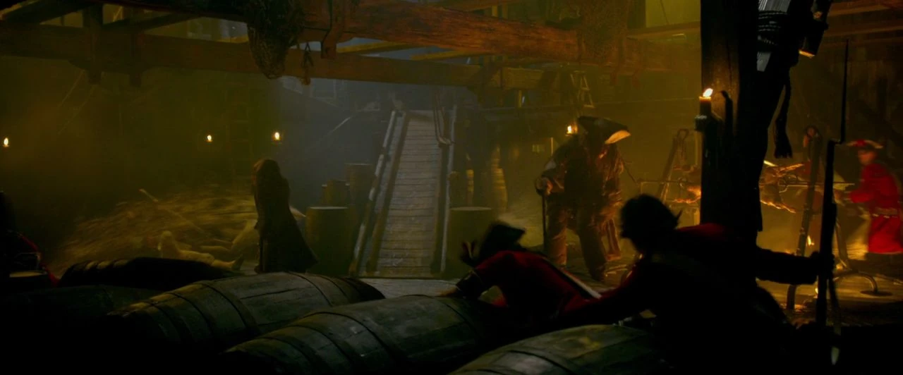 Jack and Angelica had a brief reunion, where they would talk about their past and Angelica impersonating Jack. As Angelica began asking Jack about the Fountain of Youth, as Jack was rumored to have been there, Scrum came in to warn Angelica of the King's guards searching the pub. Scrum locked the door and started blocking it as Angelica argued with Jack until the guards finally bursted through the door. While Jack and Angelica fought the guards, Scrum dashed up the stairs to hide in the rafters. Jack and Angelica had fought the guards while cutting and stabbing the pub's barrels, which sprayed ale and wine against the guards. After Jack drank out of one barrel, the guards pointed their weapons and Jack and Angelica, until Angelica used her sword to cut a lever, activating the storeroom's trap door, allowing her and Jack to escape through water which led to the River Thames.[3]