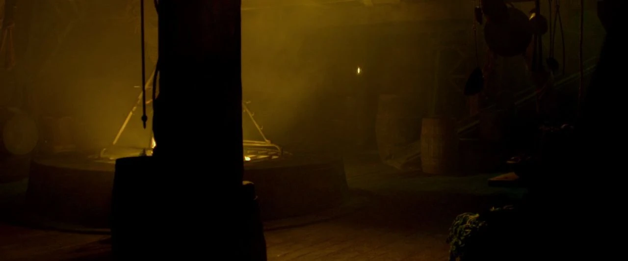 The dark, wooden storeroom of the Captain's Daughter was much larger than the diminutive pub itself.[4] It had a barbecue pit, located in the middle of the room, a ramp, and a pulley. Numerous barrels full of ale and wine could be found throughout the storeroom. Near the back, there was a lever which activated a trap door which led to the River Thames.[3]