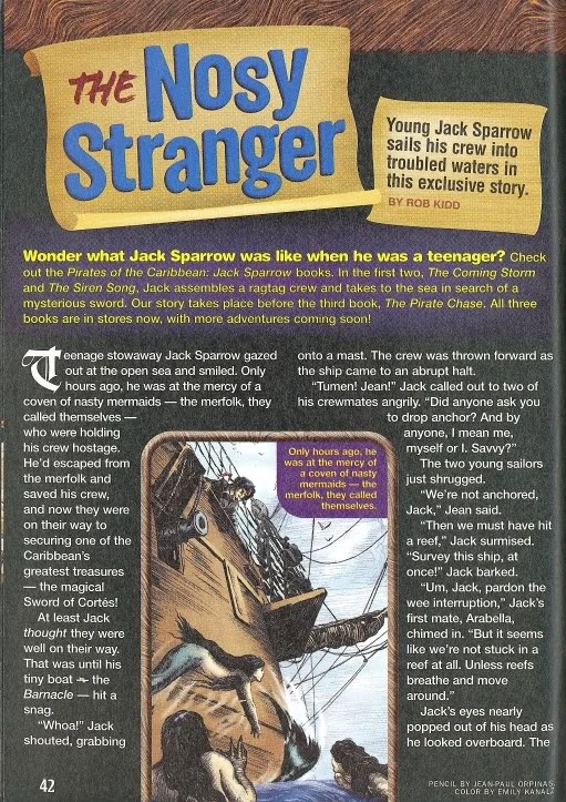 The Nosy Stranger is a short story written by Rob Kidd and set in the Pirates of the Caribbean world. It was published in Disney Adventures in August 2006. The story is chronologically set between Jack Sparrow: The Siren Song and Jack Sparrow: The Pirate Chase.