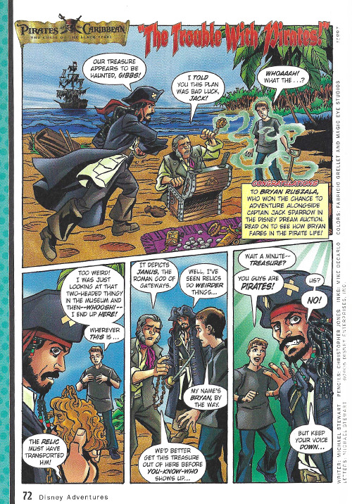 The Trouble With Pirates! is a comic published in Disney Adventures in 2005, notable for featuring Bryan Ruszala, who won the chance to adventure alongside Captain Jack Sparrow in the Disney Dream Auction. However, while unconfirmed, the comic is considered non-canon.