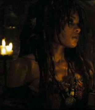 A mystic with an eye keener than any pirate's[1], Tia Dalma was a practitioner of voodoo, a hoodoo priestess with fathomless powers. She resided in a tumbledown shack perched in a treetop above the swamps of the Cypress Forest at the mouth of the Pantano River. Some believed that judging Tia Dalma by her humble home was a mistake, as she had uncanny powers to foretell the future, to summon up demons, and to look deep into men's souls. So it was to this mysterious and beautiful mystic that Jack Sparrow occasionally turned to for help.[19] Among her other traits, Tia Dalma was known to barter. She helped Jack Sparrow in his search for the Dead Man's Chest, using her crab claws to scry the location of the Flying Dutchman, and then joined on the journey to the Land of the Dead. Hector Barbossa was one of the few who knew that none other than Tia Dalma was the human incarnation of the goddess, Calypso. Barbossa persuaded Tia Dalma to join on the voyage to World's End, although it was so he could enact his scheme and release Calypso—fulfilling the deal that he made with her after she brought him back from the dead.