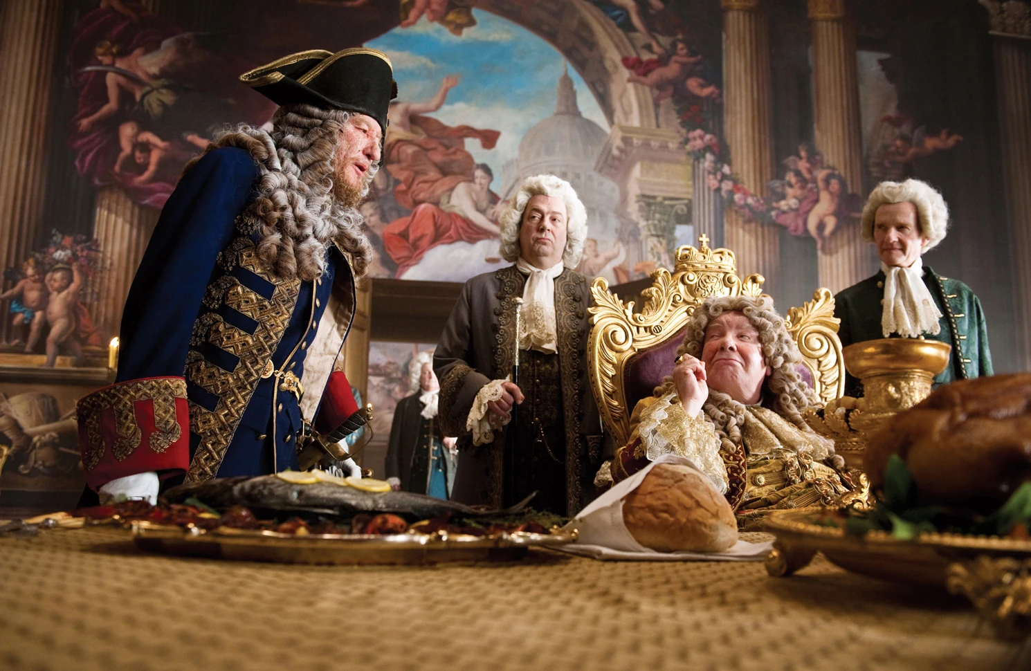 Members of King George II's court and the British Empire wear powdered wigs.